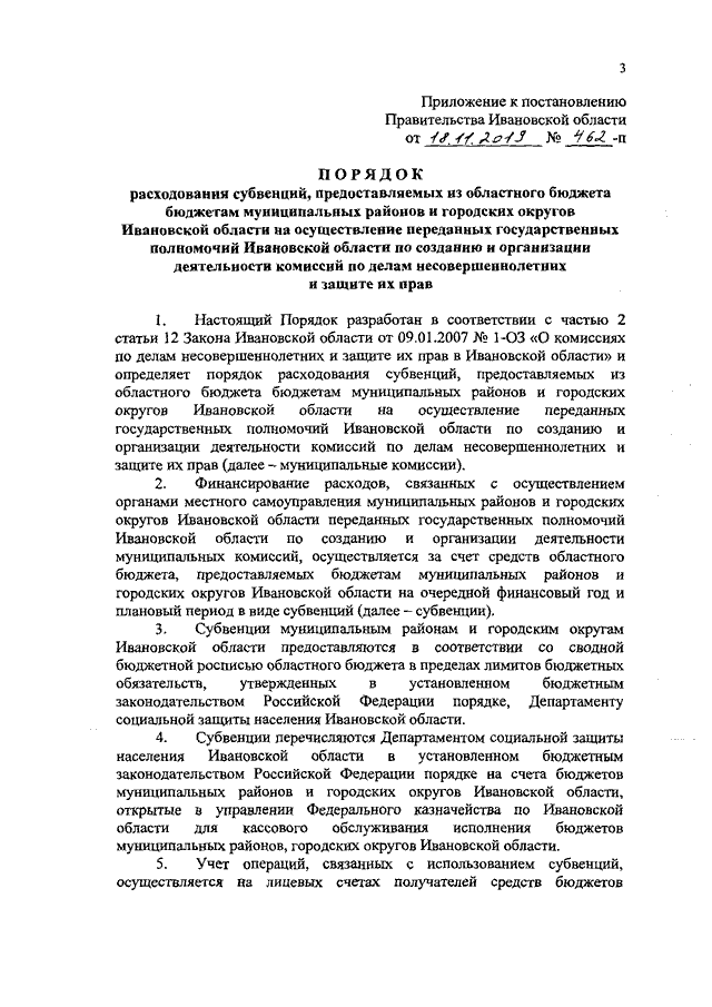 Постановление Правительства Ивановской области от 18.11.2019 N 462-п "Об утверждении Порядка расходования субвенций, предоставляемых из областного бюджета бюджетам муниципальных районов и городских округов Ивановской области на осуществление переданных государственных полномочий Ивановской области по созданию и организации деятельности комиссий по делам несовершеннолетних и защите их прав"