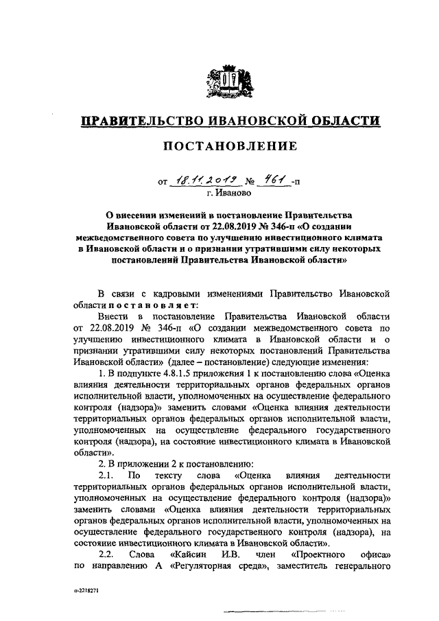 Постановление Правительства Ивановской области от 18.11.2019 N 461-п "О внесении изменений в постановление Правительства Ивановской области от 22.08.2019 N 346-п "О создании межведомственного совета по улучшению инвестиционного климата в Ивановской области и о признании утратившими силу некоторых постановлений Правительства Ивановской области"
