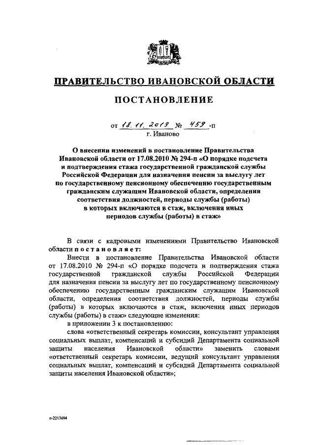 Постановление Правительства Ивановской области от 18.11.2019 N 459-п "О внесении изменений в постановление Правительства Ивановской области от 17.08.2010 N 294-п "О порядке подсчета и подтверждения стажа государственной гражданской службы Российской Федерации для назначения пенсии за выслугу лет по государственному пенсионному обеспечению государственным гражданским служащим Ивановской области, определения соответствия должностей, периоды службы (работы) в которых включаются в стаж, включения иных периодов службы (работы) в стаж"