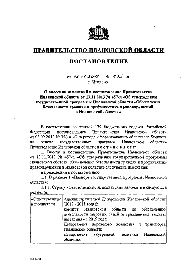Постановление Правительства Ивановской области от 18.11.2019 N 452-п "О внесении изменений в постановление Правительства Ивановской области от 13.11.2013 N 457-п "Об утверждении государственной программы Ивановской области "Обеспечение безопасности граждан и профилактика правонарушений в Ивановской области"