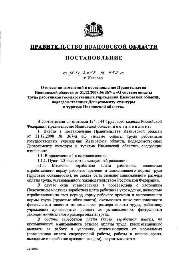 Постановление Правительства Ивановской области от 18.11.2019 N 449-п "О внесении изменений в постановление Правительства Ивановской области от 31.12.2008 N 367-п "О системе оплаты труда работников государственных учреждений Ивановской области, подведомственных Департаменту культуры и туризма Ивановской области"