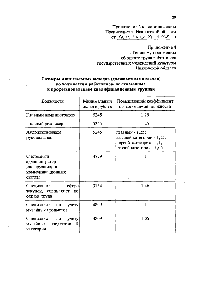 Постановление Правительства Ивановской области от 18.11.2019 N 449-п "О внесении изменений в постановление Правительства Ивановской области от 31.12.2008 N 367-п "О системе оплаты труда работников государственных учреждений Ивановской области, подведомственных Департаменту культуры и туризма Ивановской области"