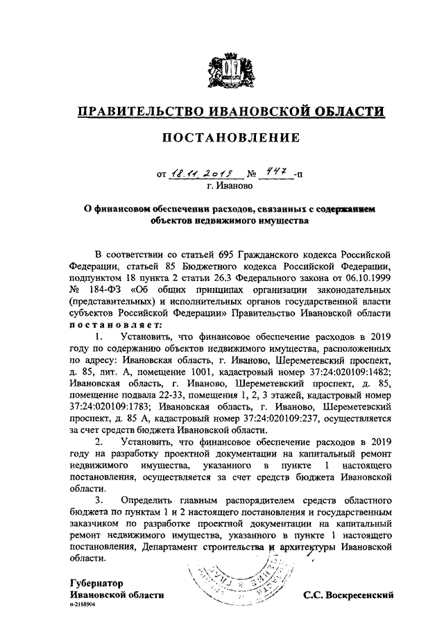 Постановление Правительства Ивановской области от 18.11.2019 N 447-п "О финансовом обеспечении расходов, связанных с содержанием объектов недвижимого имущества"