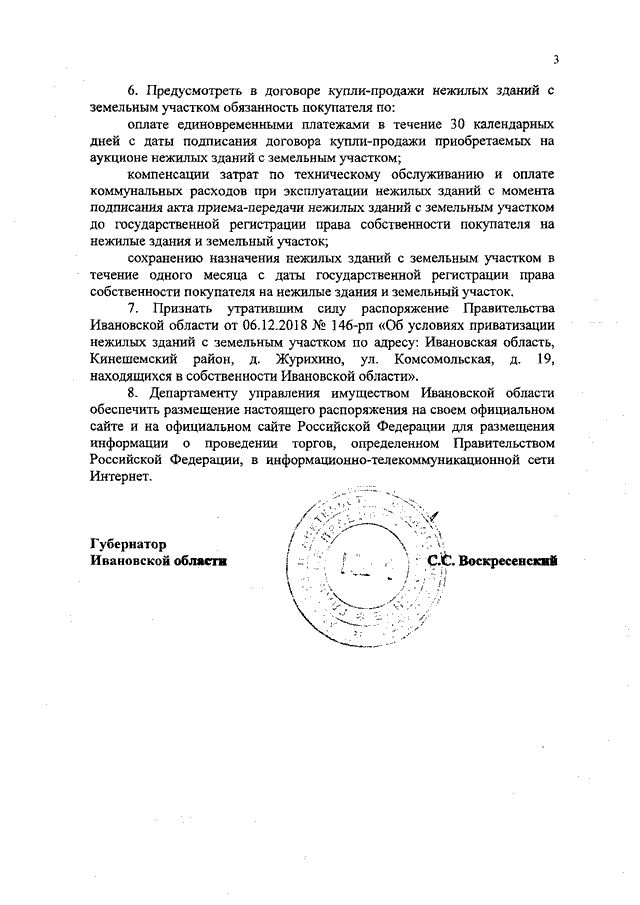 Распоряжение Правительства Ивановской области от 18.11.2019 N 173-рп "Об условиях приватизации нежилых зданий с земельным участком по адресу: Ивановская область, Кинешемский район, д. Журихино, ул. Комсомольская, д. 19, находящихся в собственности Ивановской области"