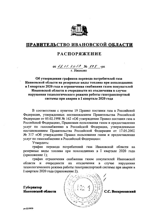 Распоряжение Правительства Ивановской области от 18.11.2019 N 175-рп "Об утверждении графиков перевода потребителей газа Ивановской области на резервные виды топлива при похолоданиях в I квартале 2020 года и ограничения снабжения газом покупателей Ивановской области и очередности их отключения в случае нарушения технологического режима работы газотранспортной системы при аварии в I квартале 2020 года"
