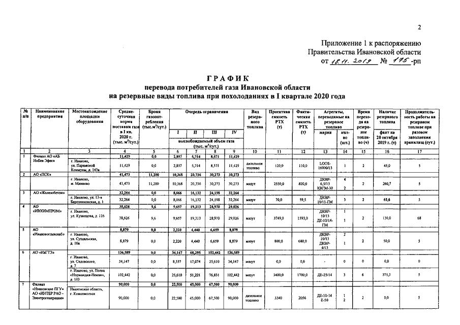 Распоряжение Правительства Ивановской области от 18.11.2019 N 175-рп "Об утверждении графиков перевода потребителей газа Ивановской области на резервные виды топлива при похолоданиях в I квартале 2020 года и ограничения снабжения газом покупателей Ивановской области и очередности их отключения в случае нарушения технологического режима работы газотранспортной системы при аварии в I квартале 2020 года"