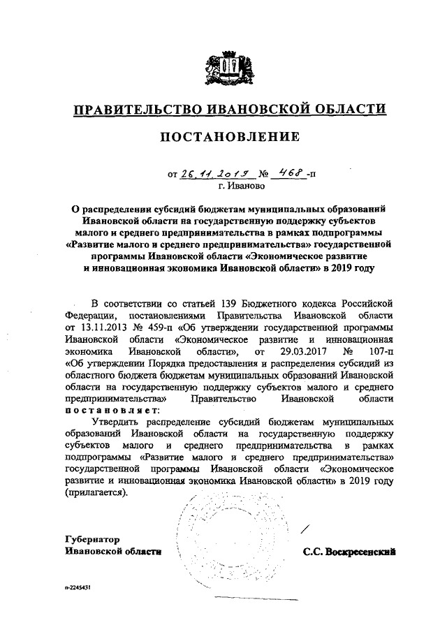 Постановление Правительства Ивановской области от 26.11.2019 N 468-п "О распределении субсидий бюджетам муниципальных образований Ивановской области на государственную поддержку субъектов малого и среднего предпринимательства в рамках подпрограммы "Развитие малого и среднего предпринимательства" государственной программы Ивановской области "Экономическое развитие и инновационная экономика Ивановской области" в 2019 году"