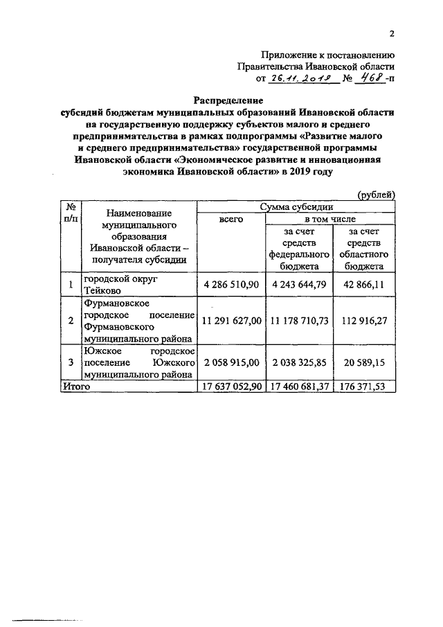 Постановление Правительства Ивановской области от 26.11.2019 N 468-п "О распределении субсидий бюджетам муниципальных образований Ивановской области на государственную поддержку субъектов малого и среднего предпринимательства в рамках подпрограммы "Развитие малого и среднего предпринимательства" государственной программы Ивановской области "Экономическое развитие и инновационная экономика Ивановской области" в 2019 году"