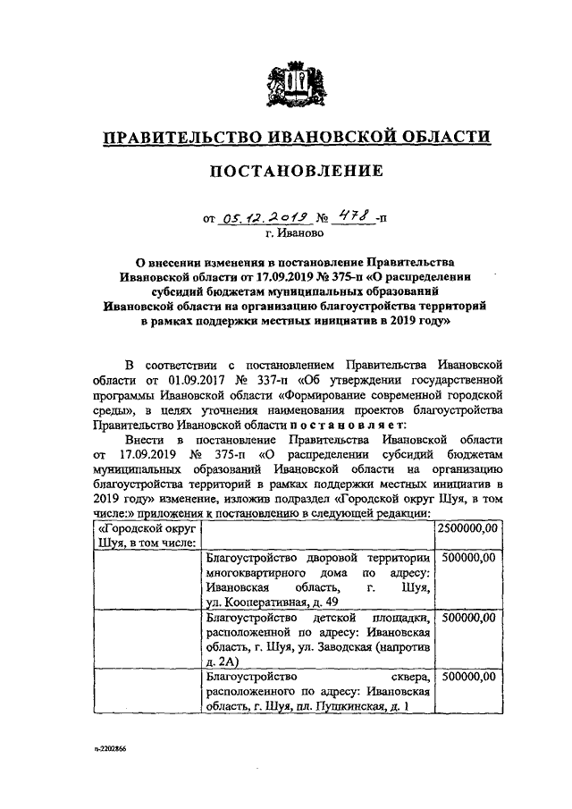 Постановление Правительства Ивановской области от 05.12.2019 N 478-п "О внесении изменения в постановление Правительства Ивановской области от 17.09.2019 N 375-п "О распределении субсидий бюджетам муниципальных образований Ивановской области на организацию благоустройства территорий в рамках поддержки местных инициатив в 2019 году"