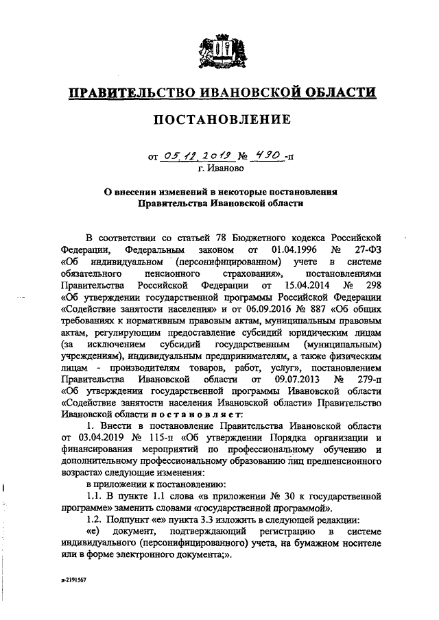 Постановление Правительства Ивановской области от 05.12.2019 N 490-п "О внесении изменений в некоторые постановления Правительства Ивановской области"