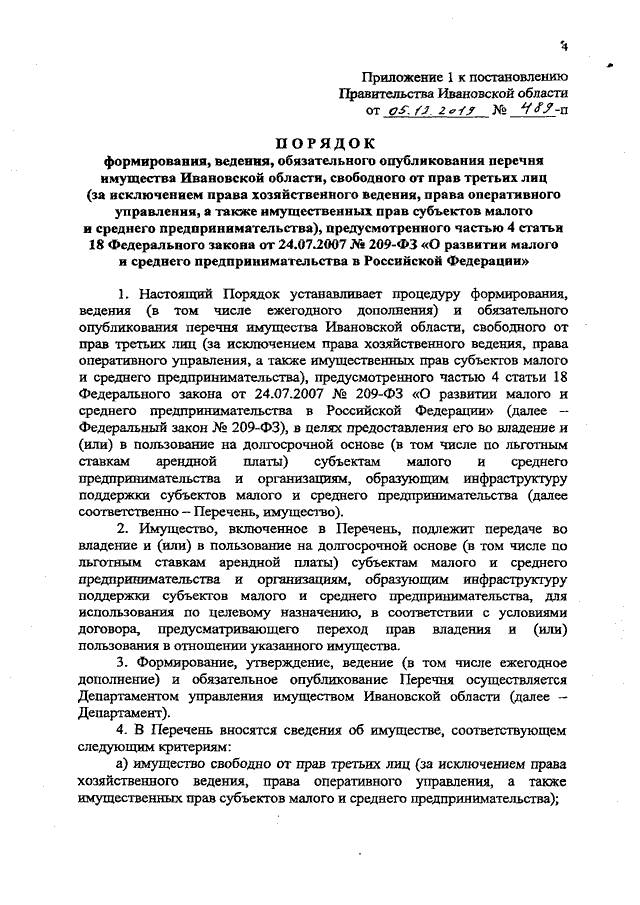 Постановление Правительства Ивановской области от 05.12.2019 N 489-п "Об имущественной поддержке субъектов малого и среднего предпринимательства при предоставлении имущества, находящегося в собственности Ивановской области, и признании утратившими силу некоторых постановлений Правительства Ивановской области" (вместе с "Порядком формирования, ведения, обязательного опубликования перечня имущества Ивановской области, свободного от прав третьих лиц (за исключением права хозяйственного ведения, права оперативного управления, а также имущественных прав субъектов малого и среднего предпринимательства), предусмотренного частью 4 статьи 18 Федерального закона от 24.07.2007 N 209-ФЗ "О развитии малого и среднего предпринимательства в Российской Федерации", "Порядком и условиями предоставления во владение и (или) пользование на долгосрочной основе имущества Ивановской области, свободного от прав третьих лиц (за исключением права хозяйственного ведения, права оперативного управления, а также имущественных прав субъектов малого и среднего предпринимательства), предусмотренного частью 4 статьи 18 Федерального закона от 24.07.2007 N 209-ФЗ "О развитии малого и среднего предпринимательства в Российской Федерации")