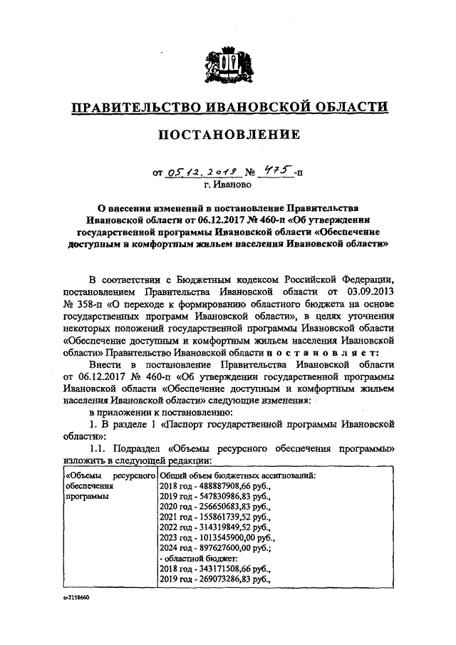 Постановление Правительства Ивановской области от 05.12.2019 N 475-п "О внесении изменений в постановление Правительства Ивановской области от 06.12.2017 N 460-п "Об утверждении государственной программы Ивановской области "Обеспечение доступным и комфортным жильем населения Ивановской области"