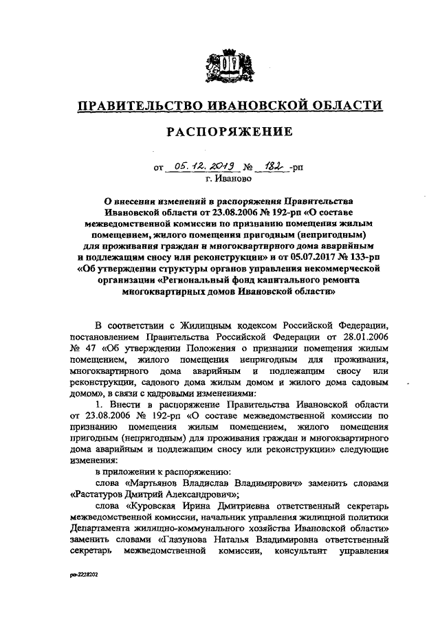 Распоряжение Правительства Ивановской области от 05.12.2019 N 182-рп "О внесении изменений в распоряжения Правительства Ивановской области от 23.08.2006 N 192-рп "О составе межведомственной комиссии по признанию помещения жилым помещением, жилого помещения пригодным (непригодным) для проживания граждан и многоквартирного дома аварийным и подлежащим сносу или реконструкции" и от 05.07.2017 N 133-рп "Об утверждении структуры органов управления некоммерческой организации "Региональный фонд капитального ремонта многоквартирных домов Ивановской области"