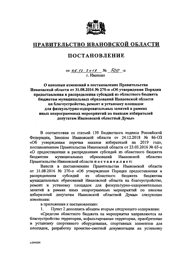 Постановление Правительства Ивановской области от 05.12.2019 N 500-п "О внесении изменений в постановление Правительства Ивановской области от 31.08.2016 N 270-п "Об утверждении Порядка предоставления и распределения субсидий из областного бюджета бюджетам муниципальных образований Ивановской области на благоустройство, ремонт и установку площадок для физкультурно-оздоровительных занятий в рамках иных непрограммных мероприятий по наказам избирателей депутатам Ивановской областной Думы"
