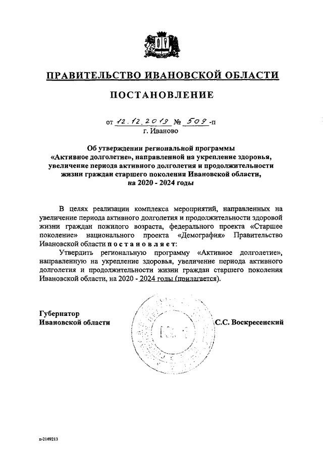 Постановление Правительства Ивановской области от 12.12.2019 N 509-п "Об утверждении региональной программы "Активное долголетие", направленной на укрепление здоровья, увеличение периода активного долголетия и продолжительности жизни граждан старшего поколения Ивановской области, на 2020 - 2024 годы"