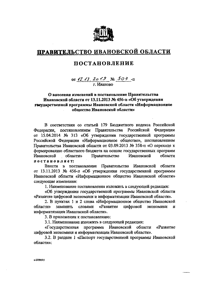 Постановление Правительства Ивановской области от 12.12.2019 N 507-п "О внесении изменений в постановление Правительства Ивановской области от 13.11.2013 N 456-п "Об утверждении государственной программы Ивановской области "Информационное общество Ивановской области"
