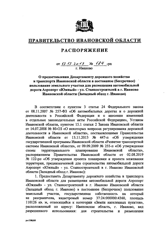 Распоряжение Правительства Ивановской области от 12.12.2019 N 184-рп "О предоставлении Департаменту дорожного хозяйства и транспорта Ивановской области в постоянное (бессрочное) пользование земельного участка для размещения автомобильной дороги Аэропорт "Южный" - ул. Станкостроителей в г. Иваново Ивановской области (Западный обход г. Иваново)"