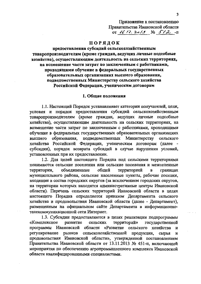Постановление Правительства Ивановской области от 16.12.2019 N 512-п "Об утверждении Порядка предоставления субсидий сельскохозяйственным товаропроизводителям (кроме граждан, ведущих личные подсобные хозяйства), осуществляющим деятельность на сельских территориях, на возмещение части затрат по заключенным с работниками, проходящими обучение в федеральных государственных образовательных организациях высшего образования, подведомственных Министерству сельского хозяйства Российской Федерации, ученическим договорам"