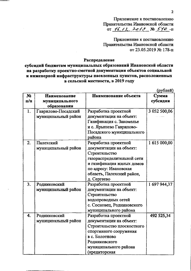 Постановление Правительства Ивановской области от 16.12.2019 N 510-п "О внесении изменения в постановление Правительства Ивановской области от 23.05.2019 N 178-п "О распределении субсидий бюджетам муниципальных образований Ивановской области на разработку проектно-сметной документации объектов социальной и инженерной инфраструктуры населенных пунктов, расположенных в сельской местности, в 2019 году"