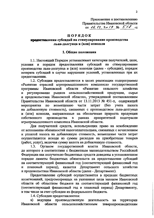 Постановление Правительства Ивановской области от 16.12.2019 N 518-п "Об утверждении Порядка предоставления субсидий на стимулирование производства льна-долгунца и (или) конопли"