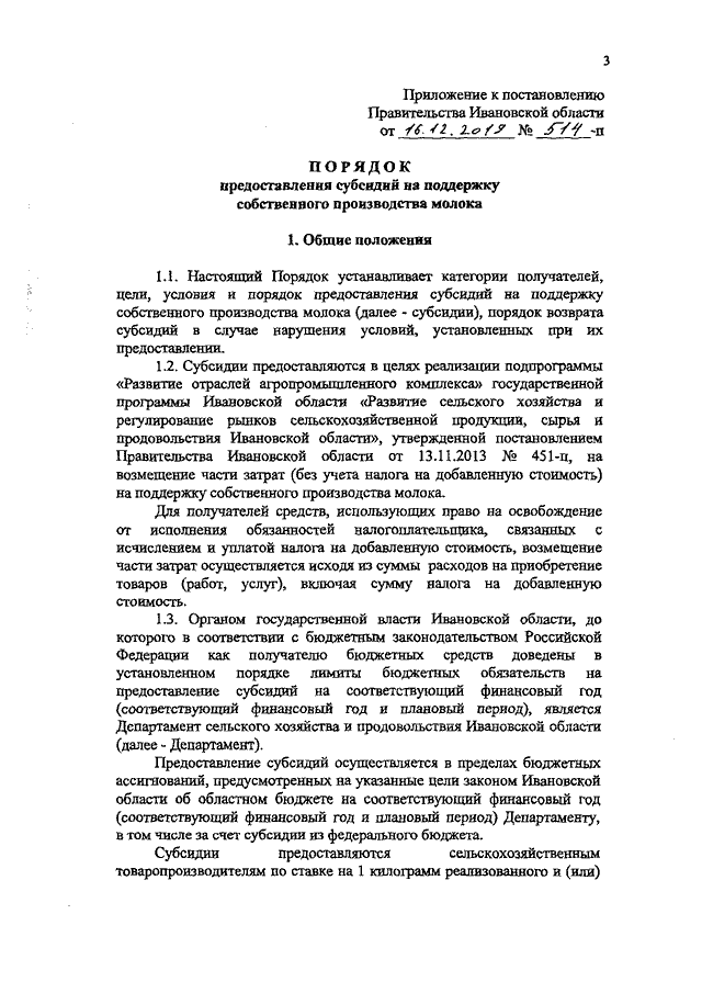 Постановление Правительства Ивановской области от 16.12.2019 N 514-п "Об утверждении Порядка предоставления субсидии на поддержку собственного производства молока"