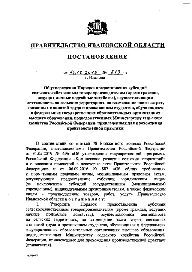Постановление Правительства Ивановской области от 16.12.2019 N 513-п "Об утверждении Порядка предоставления субсидий сельскохозяйственным товаропроизводителям (кроме граждан, ведущих личные подсобные хозяйства), осуществляющим деятельность на сельских территориях, на возмещение части затрат, связанных с оплатой труда и проживанием студентов, обучающихся в федеральных государственных образовательных организациях высшего образования, подведомственных Министерству сельского хозяйства Российской Федерации, привлеченных для прохождения производственной практики"