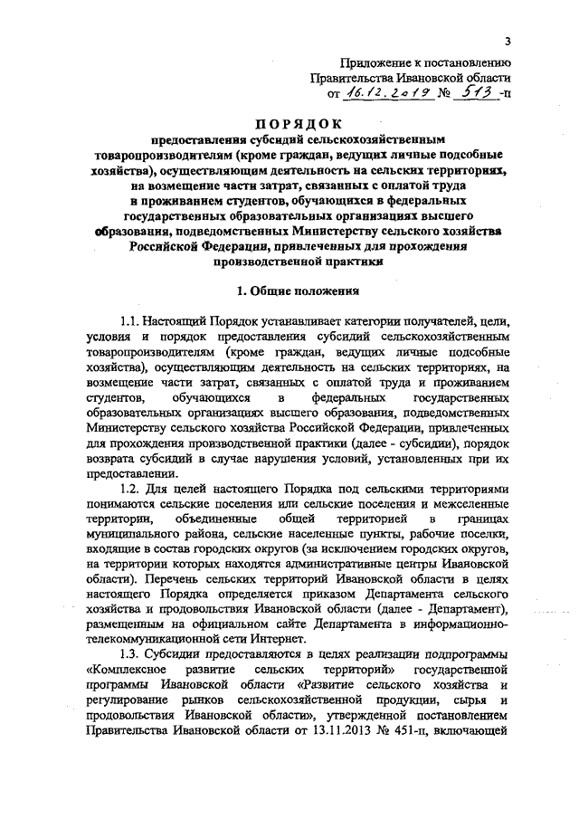 Постановление Правительства Ивановской области от 16.12.2019 N 513-п "Об утверждении Порядка предоставления субсидий сельскохозяйственным товаропроизводителям (кроме граждан, ведущих личные подсобные хозяйства), осуществляющим деятельность на сельских территориях, на возмещение части затрат, связанных с оплатой труда и проживанием студентов, обучающихся в федеральных государственных образовательных организациях высшего образования, подведомственных Министерству сельского хозяйства Российской Федерации, привлеченных для прохождения производственной практики"