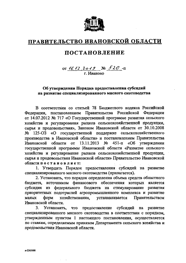 Постановление Правительства Ивановской области от 16.12.2019 N 520-п "Об утверждении Порядка предоставления субсидий на развитие специализированного мясного скотоводства"