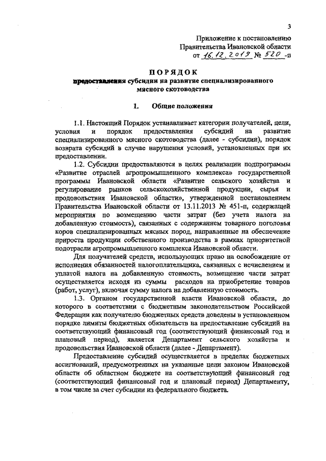 Постановление Правительства Ивановской области от 16.12.2019 N 520-п "Об утверждении Порядка предоставления субсидий на развитие специализированного мясного скотоводства"