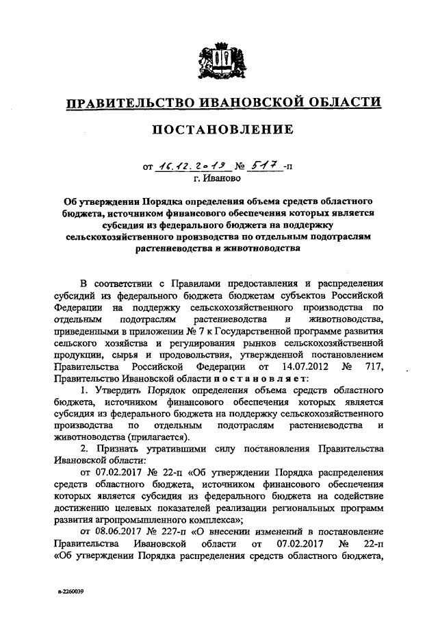 Постановление Правительства Ивановской области от 16.12.2019 N 517-п "Об утверждении Порядка определения объема средств областного бюджета, источником финансового обеспечения которых является субсидия из федерального бюджета на поддержку сельскохозяйственного производства по отдельным подотраслям растениеводства и животноводства"