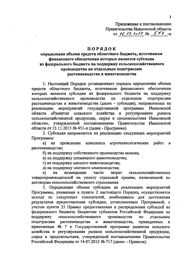 Постановление Правительства Ивановской области от 16.12.2019 N 517-п "Об утверждении Порядка определения объема средств областного бюджета, источником финансового обеспечения которых является субсидия из федерального бюджета на поддержку сельскохозяйственного производства по отдельным подотраслям растениеводства и животноводства"