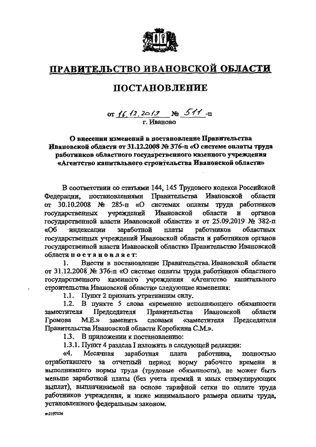 Постановление Правительства Ивановской области от 16.12.2019 N 511-п "О внесении изменений в постановление Правительства Ивановской области от 31.12.2008 N 376-п "О системе оплаты труда работников областного государственного казенного учреждения "Агентство капитального строительства Ивановской области"