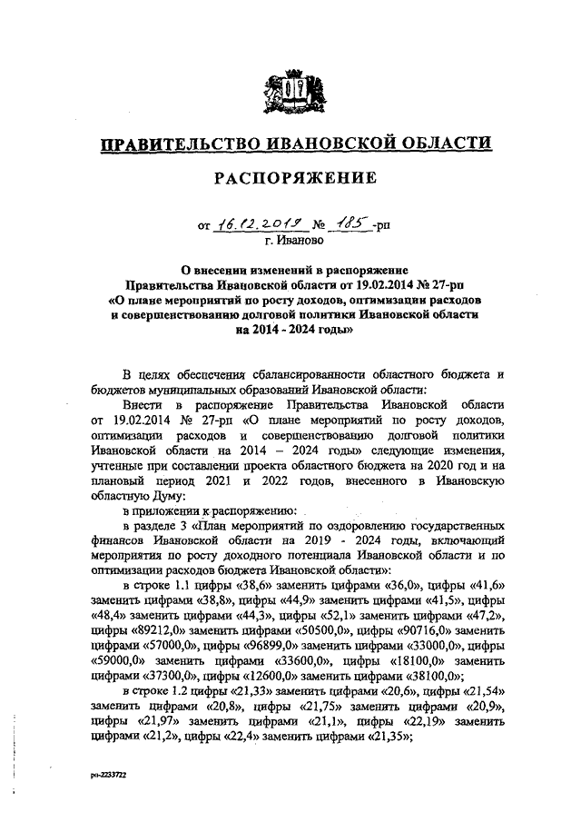 Распоряжение Правительства Ивановской области от 16.12.2019 N 185-рп "О внесении изменений в распоряжение Правительства Ивановской области от 19.02.2014 N 27-рп "О плане мероприятий по росту доходов, оптимизации расходов и совершенствованию долговой политики Ивановской области на 2014 - 2024 годы"