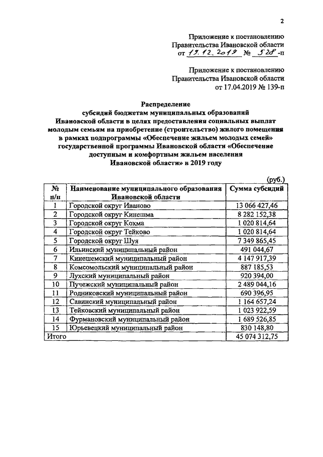 Постановление Правительства Ивановской области от 19.12.2019 N 528-п "О внесении изменения в постановление Правительства Ивановской области от 17.04.2019 N 139-п "О распределении субсидий бюджетам муниципальных образований Ивановской области в целях предоставления социальных выплат молодым семьям на приобретение (строительство) жилого помещения в рамках подпрограммы "Обеспечение жильем молодых семей" государственной программы Ивановской области "Обеспечение доступным и комфортным жильем населения Ивановской области" в 2019 году"