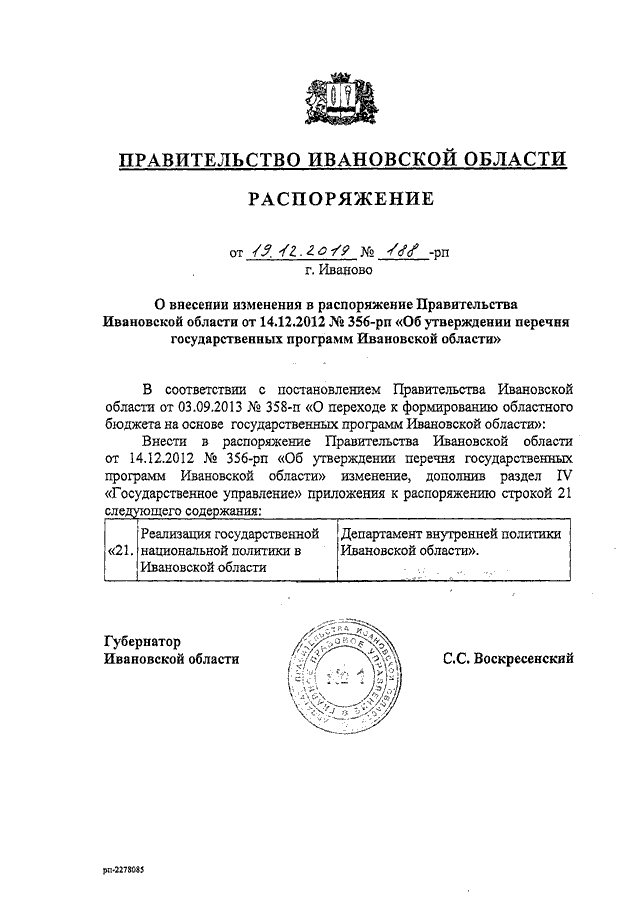 Распоряжение Правительства Ивановской области от 19.12.2019 N 188-рп "О внесении изменения в распоряжение Правительства Ивановской области от 14.12.2012 N 356-рп "Об утверждении перечня государственных программ Ивановской области"