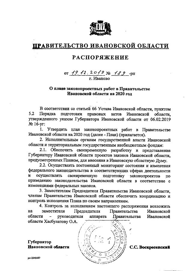 Распоряжение Правительства Ивановской области от 19.12.2019 N 189-рп "О плане законопроектных работ в Правительстве Ивановской области на 2020 год"