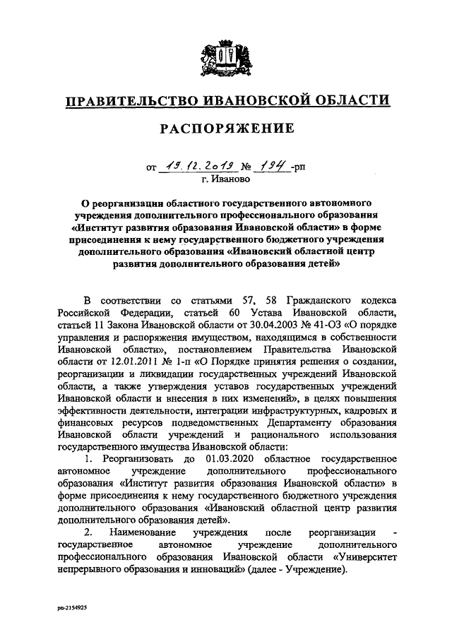 Распоряжение Правительства Ивановской области от 19.12.2019 N 194-рп "О реорганизации областного государственного автономного учреждения дополнительного профессионального образования "Институт развития образования Ивановской области" в форме присоединения к нему государственного бюджетного учреждения дополнительного образования "Ивановский областной центр развития дополнительного образования детей"