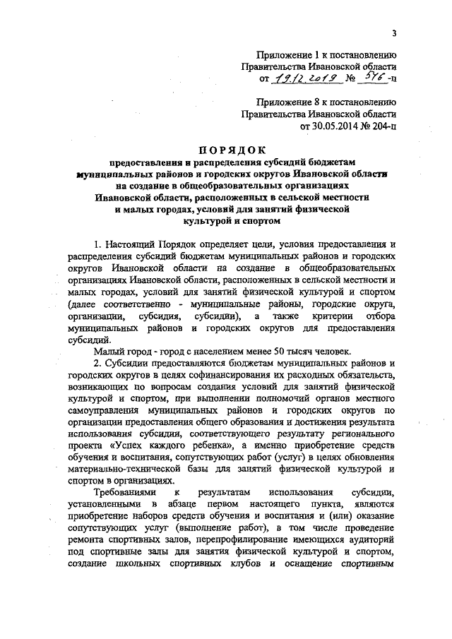 Постановление Правительства Ивановской области от 19.12.2019 N 546-п "О внесении изменений в постановление Правительства Ивановской области от 30.05.2014 N 204-п "Об утверждении комплекса мероприятий по созданию в общеобразовательных организациях Ивановской области, расположенных в сельской местности, условий для занятий физической культурой и спортом и Порядка предоставления и распределения субсидий бюджетам муниципальных районов Ивановской области на создание в общеобразовательных организациях Ивановской области, расположенных в сельской местности, условий для занятий физической культурой и спортом" (вместе с "Порядком предоставления и распределения субсидий бюджетам муниципальных районов и городских округов Ивановской области на создание в общеобразовательных организациях Ивановской области, расположенных в сельской местности и малых городах, условий для занятий физической культурой и спортом", "Перечнем мероприятий по созданию в общеобразовательных организациях Ивановской области, расположенных в сельской местности и малых городах, условий для занятий физической культурой и спортом в 2020 - 2022 годах")
