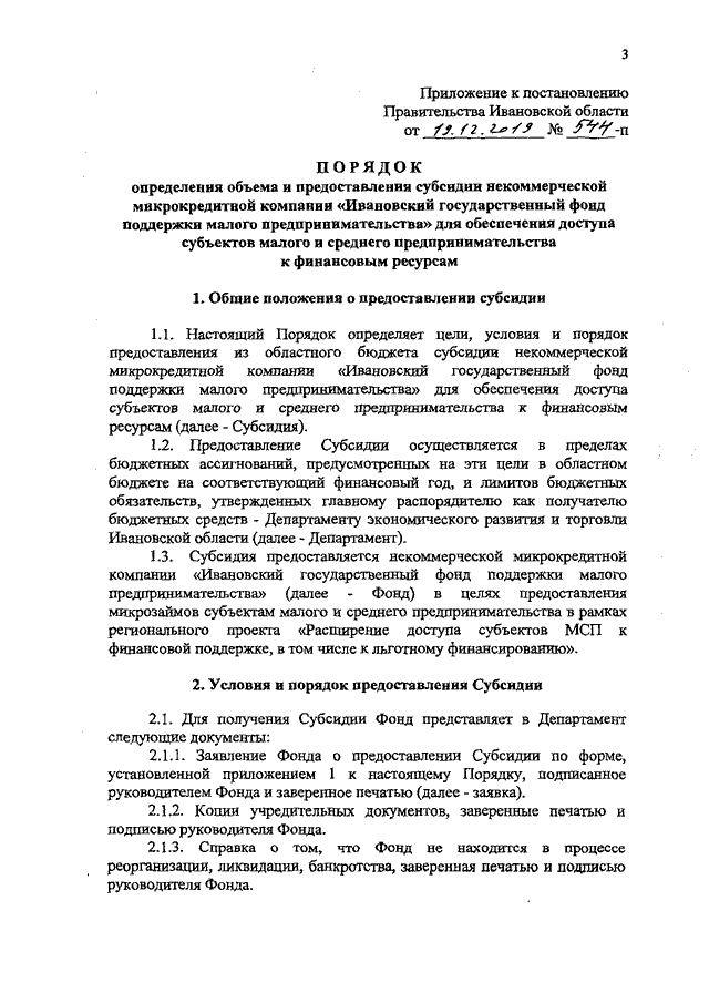 Постановление Правительства Ивановской области от 19.12.2019 N 544-п "Об утверждении Порядка определения объема и предоставления субсидии некоммерческой микрокредитной компании "Ивановский государственный фонд поддержки малого предпринимательства" для обеспечения доступа субъектов малого и среднего предпринимательства к финансовым ресурсам"