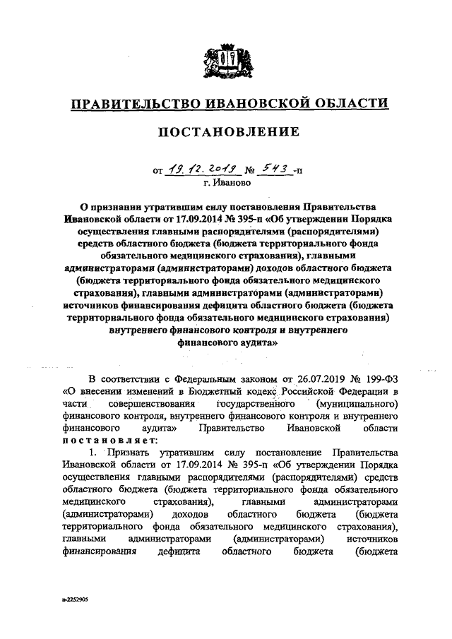 Постановление Правительства Ивановской области от 19.12.2019 N 543-п "О признании утратившим силу постановления Правительства Ивановской области от 17.09.2014 N 395-п "Об утверждении Порядка осуществления главными распорядителями (распорядителями) средств областного бюджета (бюджета территориального фонда обязательного медицинского страхования), главными администраторами (администраторами) доходов областного бюджета (бюджета территориального фонда обязательного медицинского страхования), главными администраторами (администраторами) источников финансирования дефицита областного бюджета (бюджета территориального фонда обязательного медицинского страхования) внутреннего финансового контроля и внутреннего финансового аудита"
