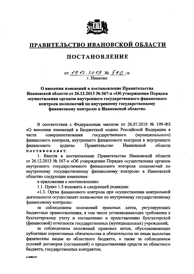 Постановление Правительства Ивановской области от 19.12.2019 N 540-п "О внесении изменений в постановление Правительства Ивановской области от 26.12.2013 N 567-п "Об утверждении Порядка осуществления органом внутреннего государственного финансового контроля полномочий по внутреннему государственному финансовому контролю в Ивановской области"