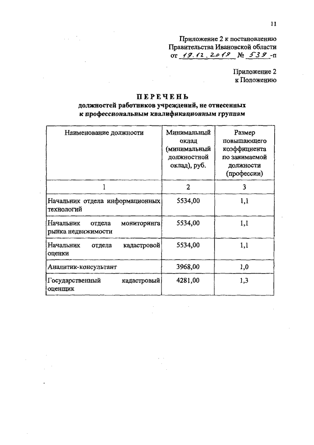 Постановление Правительства Ивановской области от 19.12.2019 N 539-п "О внесении изменений в постановление Правительства Ивановской области от 08.05.2018 N 125-п "О системе оплаты труда работников государственных учреждений Ивановской области, подведомственных Департаменту управления имуществом Ивановской области" (вместе с "Перечнем профессиональных квалификационных групп должностей работников учреждений", "Перечнем должностей работников учреждений, не отнесенных к профессиональным квалификационным группам")