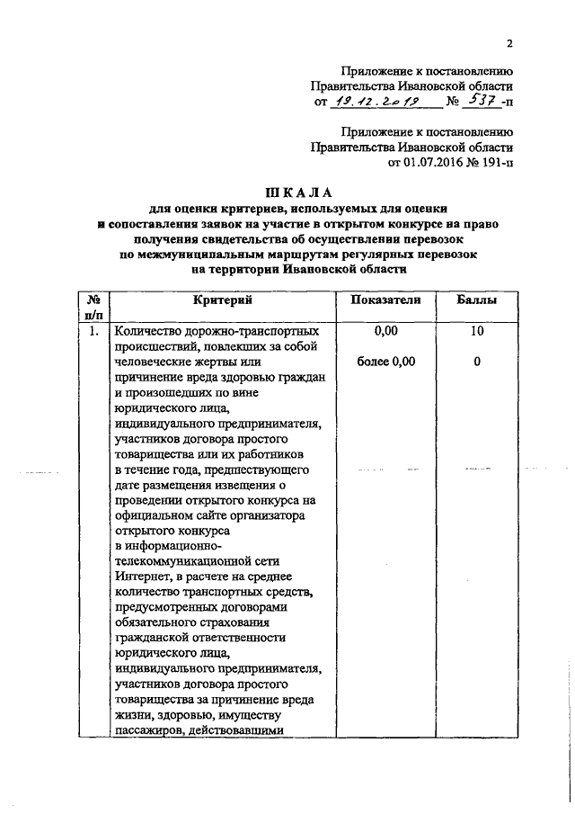 Постановление Правительства Ивановской области от 19.12.2019 N 537-п "О внесении изменения в постановление Правительства Ивановской области от 01.07.2016 N 191-п "Об утверждении шкалы для оценки критериев, используемых для оценки и сопоставления заявок на участие в открытом конкурсе на право получения свидетельства об осуществлении перевозок по межмуниципальным маршрутам регулярных перевозок на территории Ивановской области"