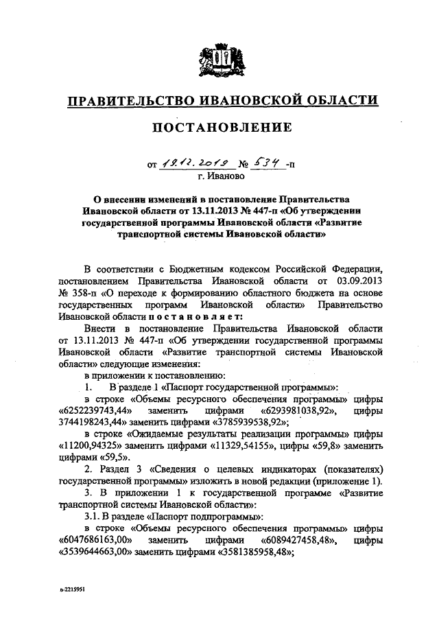 Постановление Правительства Ивановской области от 19.12.2019 N 534-п "О внесении изменений в постановление Правительства Ивановской области от 13.11.2013 N 447-п "Об утверждении государственной программы Ивановской области "Развитие транспортной системы Ивановской области"