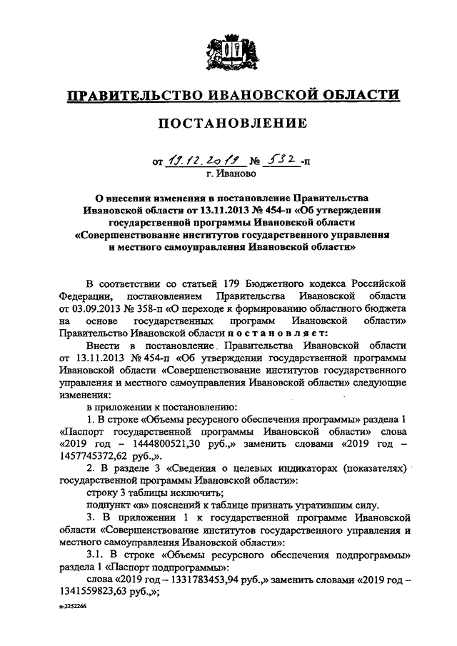 Постановление Правительства Ивановской области от 19.12.2019 N 532-п "О внесении изменения в постановление Правительства Ивановской области от 13.11.2013 N 454-п "Об утверждении государственной программы Ивановской области "Совершенствование институтов государственного управления и местного самоуправления Ивановской области"
