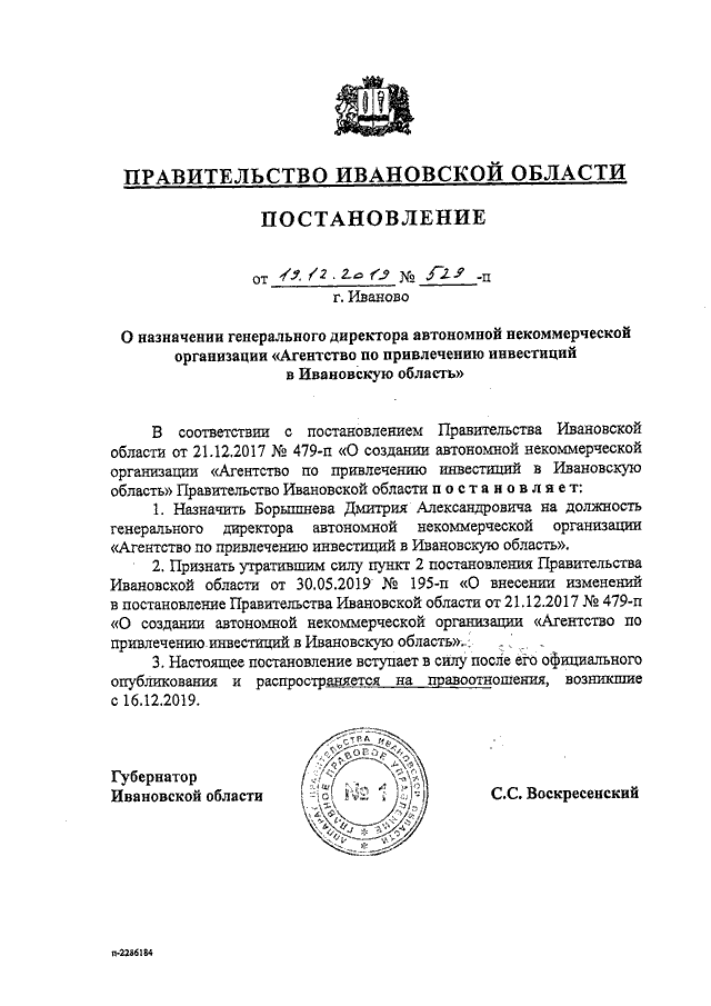 Постановление Правительства Ивановской области от 19.12.2019 N 529-п "О назначении генерального директора автономной некоммерческой организации "Агентство по привлечению инвестиций в Ивановскую область"