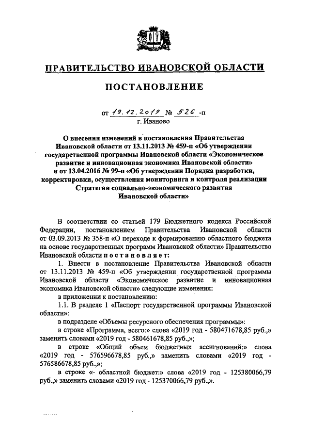 Постановление Правительства Ивановской области от 19.12.2019 N 526-п "О внесении изменений в постановления Правительства Ивановской области от 13.11.2013 N 459-п "Об утверждении государственной программы Ивановской области "Экономическое развитие и инновационная экономика Ивановской области" и от 13.04.2016 N 99-п "Об утверждении Порядка разработки, корректировки, осуществления мониторинга и контроля реализации Стратегии социально-экономического развития Ивановской области"