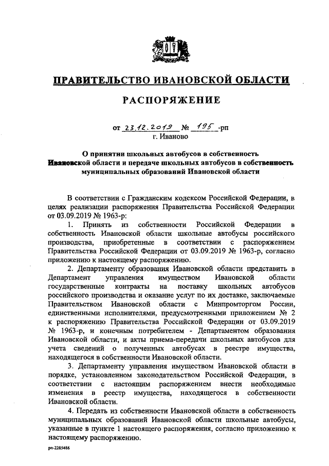 Распоряжение Правительства Ивановской области от 23.12.2019 N 195-рп "О принятии школьных автобусов в собственность Ивановской области и передаче школьных автобусов в собственность муниципальных образований Ивановской области"