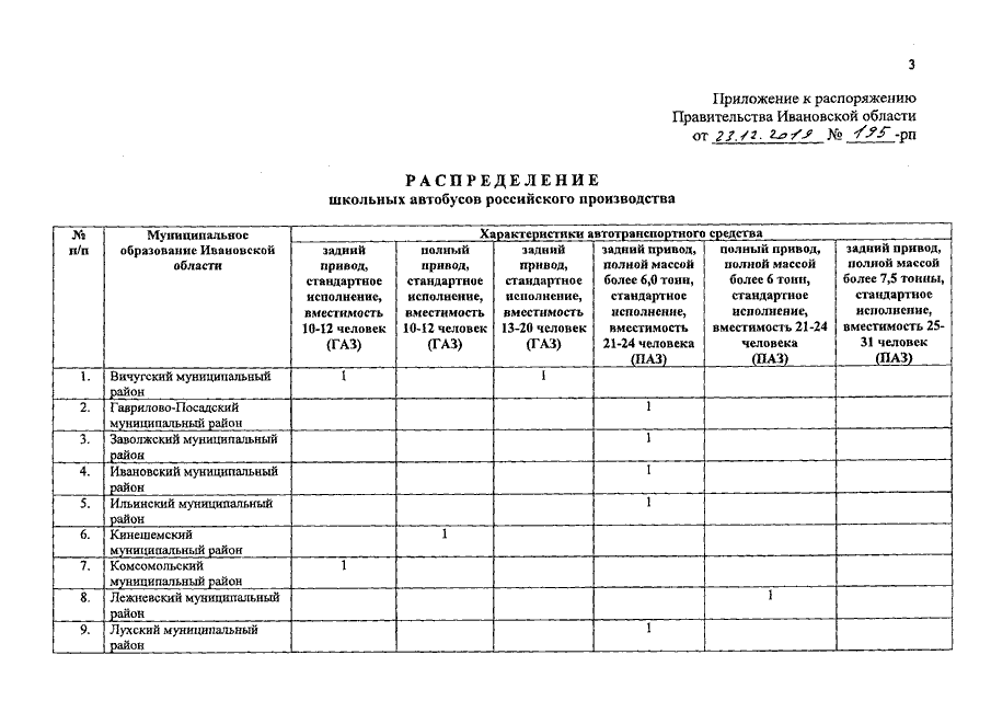 Распоряжение Правительства Ивановской области от 23.12.2019 N 195-рп "О принятии школьных автобусов в собственность Ивановской области и передаче школьных автобусов в собственность муниципальных образований Ивановской области"