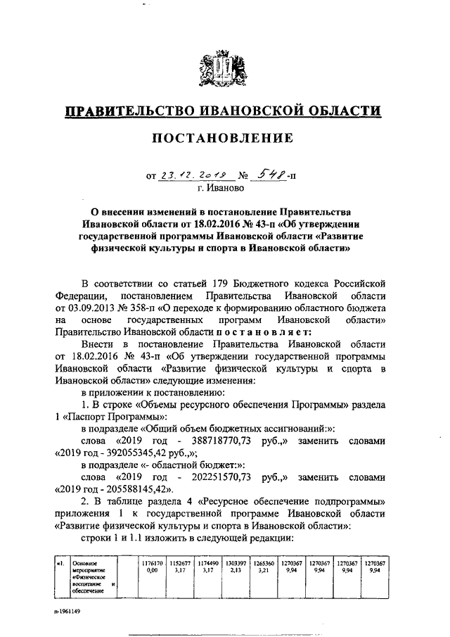 Постановление Правительства Ивановской области от 23.12.2019 N 548-п "О внесении изменений в постановление Правительства Ивановской области от 18.02.2016 N 43-п "Об утверждении государственной программы Ивановской области "Развитие физической культуры и спорта в Ивановской области" (вместе с "Порядком предоставления и распределения субсидий из областного бюджета бюджетам муниципальных районов и городских округов Ивановской области на обеспечение уровня финансирования организаций, осуществляющих спортивную подготовку в соответствии с требованиями федеральных стандартов спортивной подготовки")